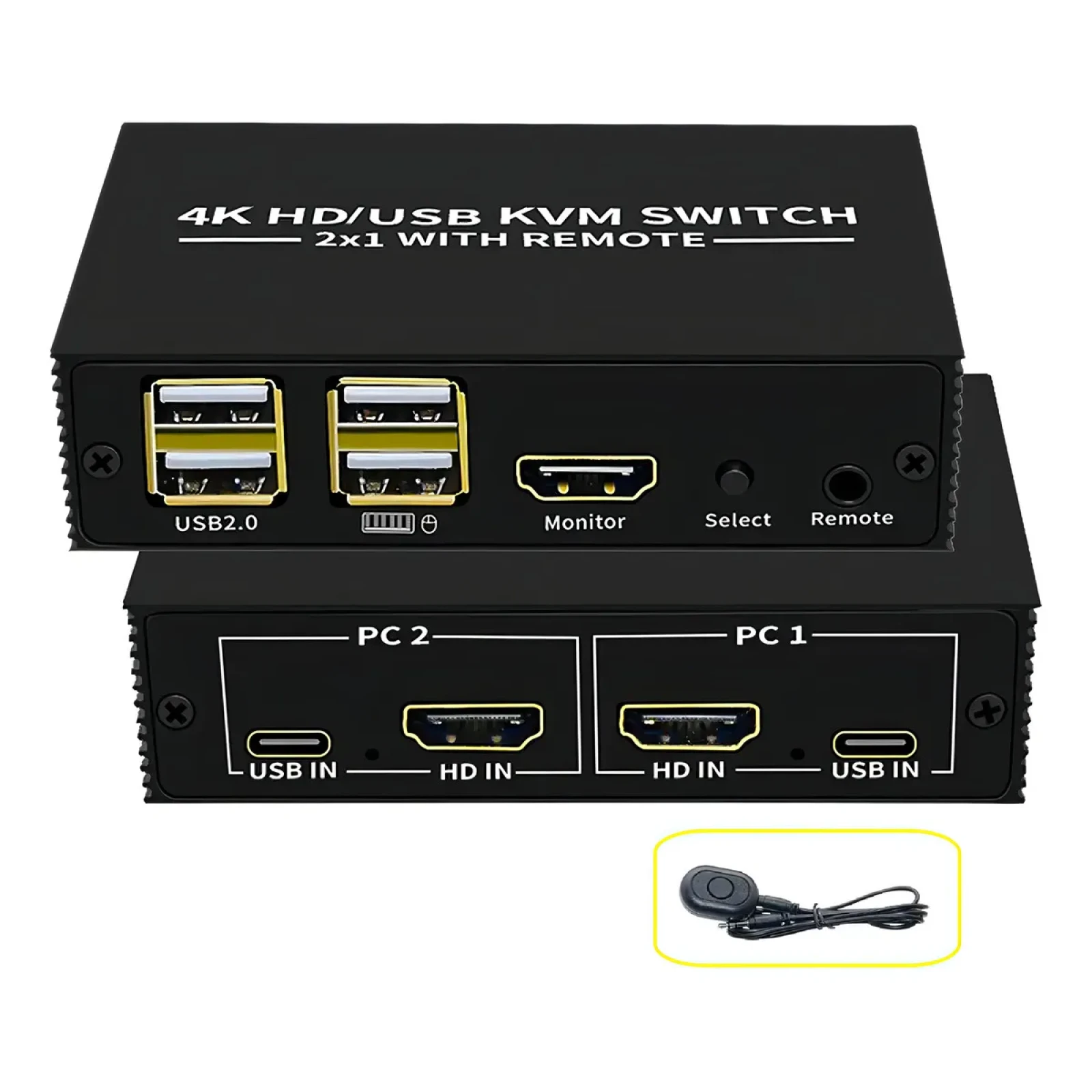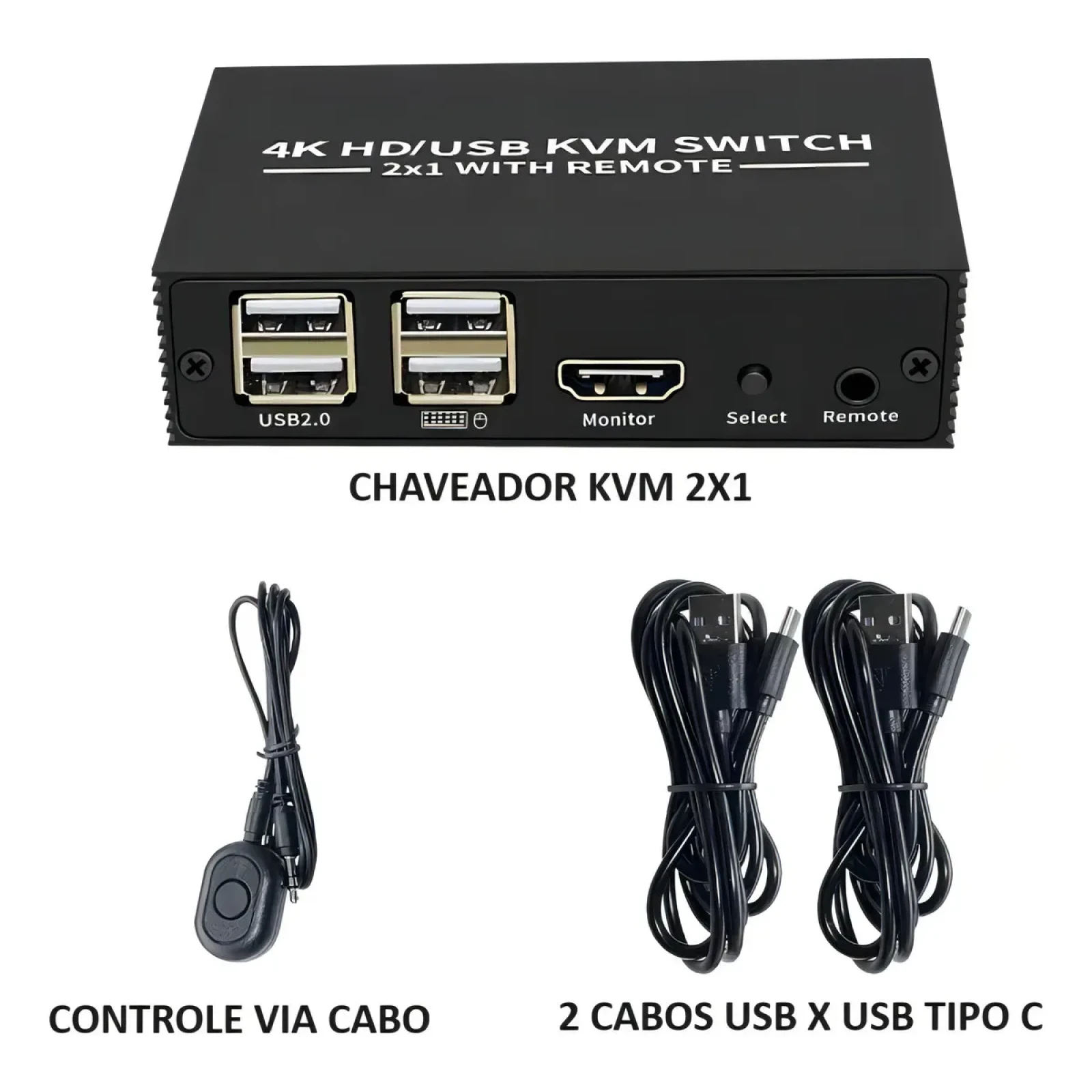 Chaveador KVM HDMI 2x1 com Hub USB Conecte 2 computadores a 1 monitor e use teclado e mouse nos dois, alternando com facilidade. Possui 2 entradas HDMI e 1 saída HDMI, além de 2 portas USB para teclado e mouse e mais 2 portas extras tipo HUB para impressora, pendrive ou outros dispositivos. Importante: o aparelho é alimentado pela conexão HDMI. É obrigatório ligar os cabos HDMI para que funcione (não funciona apenas com USB). Características principais: Alterna vídeo e periféricos entre 2 computadores Resolução até 4K (3840×2160) @ 30Hz Compatível com áudio LPCM2, 5.1, 7.1CH e Dolby 5.1CH LEDs indicadores de canal ativo Interface USB 2.0 Portas disponíveis: HDMI: 2 entradas + 1 saída USB: 2 para teclado/mouse + 2 HUB para outros dispositivos Palavras chaves: Chaveador KVM HDMI 2x1, Switch KVM HDMI, KVM HDMI 2 entradas 1 saída, KVM com hub USB, Seletor USB Teclado Mouse, KVM USB HDMI 4K, Chaveador HDMI com USB Hub 2 PCs 1 monitor, Chaveador teclado e mouse, Compartilhador de monitor HDMI , Seletor HDMI 2 entradas 1 saída, Chaveador HDMI USB, Switch para monitor e teclado, Adaptador KVM HDMI USB, KVM para 2 computadores, Comutador HDMI e USB, Troca de PC com um botão, Hub USB com HDMI, Dispositivo KVM HDMI, KVM HDMI com controle remoto